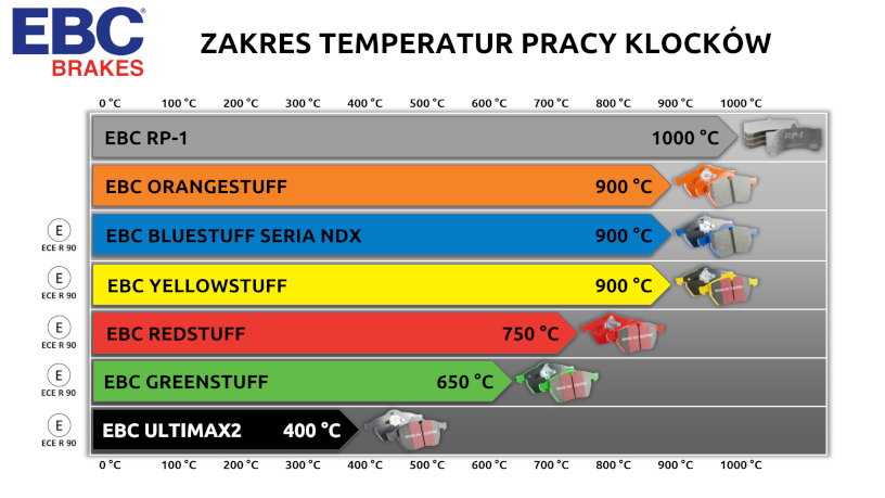 Klocki hamulcowe samochodowe ULTIMAX2 przeznaczone są do samochodów osobowych, w tym również do modeli typu Van i Suv (4x4). Ten rodzaj klocków EBC jest wykonany z najwyższej jakości materiałów ciernych, które spełniają wymogi norm bezpieczeństwa hamulców ECE R90. Klocki te są bardzo dobrymi zamiennikami dla klocków fabrycznych i występują w bardzo przystępnej cenie. Klocki produkowane są z podkładkami antywibracyjnymi, ukośnymi ścięciami, szczeliną dylatacyjną oraz unikalną powłoką brake-in, co zapewnia niezwykle krótki czas docierania. Jedną z zalet klocków EBC jest ich zdolność do eliminacji szarpania przy hamowaniu - już po pierwszych 150-600 kilometrach przebiegu praktycznie kompensują szarpnięcia o umiarkowanym natężeniu. Okładziny cierne z materiału EBC pozwalają obniżyć zużycie tarcz hamulcowych nawet o 50% w porównaniu do bardziej ściernych materiałów półmetalicznych. W przypadku oryginalnych części zamiennych dość powszechnym zjawiskiem jest konieczność wymiany tarcz hamulcowych przy każdej wymianie klocków, natomiast w przypadku produktów EBC tarcza hamulcowa, może spokojnie przetrwać nawet dwa komplety klocków, co skutkuje znaczącymi oszczędnościami - co więcej - należy zaznaczyć, że wcale nie oznacza to, że klocki zużywają się szybciej!